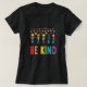 Sei Kind Design besteht aus einer gemischten Gruppe von vielen Leuten über der Nachricht "Sei Kind" in Regenbogenfarben. Ein ethnisch vielfältiges Bild, um Freundlichkeit unter allen Menschen zu suggerieren und zu unterstützen.