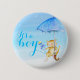 Niedliche Babyjungendusche oder -geschlecht decken die Abzeichen auf, niedliche Watercolormalerei eines wunderlichen lächelnden Haltens der Tabbykatze kennzeichnend rattern blaue Babys und Regenschirm. Liest ihn ist ein Junge. Wunderliche neue Baby-Abzeichen ideal, damit Mütter sind, sind wem Katzenliebhaber. © einzigartig gemalt im Aquarell und von Sarah Trett entworfen. www.sarahtrett.com für www.mylittleeden.com auf zazzle.