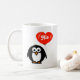 Sein und ihrs zusammenpassendes Set der Penguin-Tassen |. Niedliche Wohngestaltung für gerade verheiratetes weds eben/Ehemann- und Ehefraupaare. Romantische Geschenkidee für Jungvermählten/Braut und Bräutigam. Auch Spaß für Hochzeitstag. Kundenspezifische Hintergrundfarbe hinter rotem Herzen. Doppeltes versah Entwurf mit Seiten. Tiervogel-Cartoon mit rotem Herzballon.