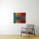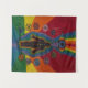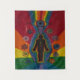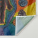 Dieses Kunstwerk ist ein lebendiges und farbenfroh zeichnend Werk, das eine zentrale Figur mit verschiedenen geometrischen Formen und Mustern aufweist. Der Hintergrund ist in verschiedene Farbabschnitte unterteilt, wodurch ein Regenbogeneffekt entsteht, der von der Mitte ausstrahlt. Die Farben Rot, Orange, Gelb, Grün und Blau sind in einem Farbverlauf angeordnet. Im Zentrum des Kunstwerks befindet sich eine schwarze Silhouette einer menschlichen Figur, die mit mehreren Farbschichten umrissen ist, die einer Aura ähneln. Über der Figur befindet sich ein großes Auge mit einer Regenbogenfarben-Iris und einem schwarzen Schüler, der in einer dreieckigen Form eingeschlossen ist. Das Auge scheint regenbogenfarbene Balken auszustrahlen, die sich nach außen erstrecken. Um die Zentralfigur herum gibt es verschiedene geometrische Formen, darunter Kreise, Dreiecke und Polygone, die jeweils mit komplexen Mustern gefüllt sind. Diese Formen sind symmetrisch um die Figur angeordnet, was die Gesamtkomplexität und das visuelle Interesse des Stückes erhöht. Das Kunstwerk ist interessant und relevant, da es lebendige Farben, komplexe Muster und symbolische Elemente verwendet, die Themen der Spiritualität, Energie und Vernetzung vermitteln können. Die Kombination geometrischer Formen mit der zentralen menschlichen Figur legt den Fokus auf die Beziehung zwischen Individuum und Universum nahe.