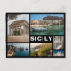 Postkarte einer Collage mit mehreren Fotos von Stränden, römischer Tempel, Scopello, Salzpfannen und Cefalù auf der Insel Sizilien in einem schwarzen Rahmen mit dem Text: "Sizilien".