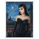 Pinup Stil digitale Malerei einer jungen Frau mit langen schwarzen Haaren, die ein Korsett tragen. Im Hintergrund genießen Sie den Blick in die Nacht auf eine fantasievolle europäische Stadt.