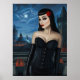 Pinup Stil digitale Malerei einer jungen Frau mit langen schwarzen Haaren, die ein Korsett tragen. Im Hintergrund genießen Sie den Blick in die Nacht auf eine fantasievolle europäische Stadt.