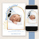 Geburtsankündigung für Fotos nach Maß. Die Fotovorlage ist ein Set für Sie, um Ihr eigenes Foto hinzuzufügen, das in einem goldenen Bogen mit feinem Blattwerk gerahmt ist. "Gesegnet und dankbar" wird in kühnen, gewölbten Typografie geschrieben. Der Rest des Textes ist vollständig editierbar, damit Sie Ihren Babynamen, Geburtsdaten und Ihren eigenen Namen anpassen können. Ein elegantes, modernes Design, um ein Bild Ihres neuen Baby-Sohnes zu teilen.