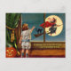 Eine schöne Vintage Halloween-Karte mit einem Kind, das eine fliegende Hexe durch das Fenster sieht.