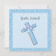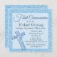 Jolie fausse séquence bleue première invitation de communion. Il présente une jolie croix étincelante avec arc satiné contre un arrière - plan stria bleu et blanc clair. Illustration tirée à la main par McBooboo.