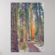 Das Bild erfasst eine ruhige Waldszene mit hohen Sequoia-Bäumen. Durch die Bäume schlängelt sich ein schmaler, schneebedeckter Weg. Die Rinde der Sequoias ist eine typisch rötlich-braune Rinde, die dem grünen Blattwerk anderer Bäume widersteht. Der Waldboden ist mit gefallenen Blätter und Kiefernnadeln bedeckt.