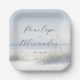 This wedding plate features a serene beach scene with soft, muted colors that create a calming and romantic atmosphere. The design includes gentle ocean waves under an overcast sky, framed by tall grasses in the foreground, all rendered in pastel blues, whites, and grays. Elegant script typography is centered on the plate, allowing for customizable names and dates, enhancing its personal touch. Perfect for intimate celebrations, this plate captures the essence of a peaceful seaside moment, making it ideal for weddings or special occasions by the shore.