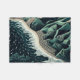 Serene Shores: This stunning top-down illustration captures the harmony of land and sea, featuring waves gently breaking on sandy beaches with lush green mountains in the background. Rendered in soothing shades of dark blue-green, the artwork evokes a sense of tranquility and balance. The intricate detail of the ocean’s patterns meeting the shore, paired with the trees lining the water’s edge, enhances the peaceful atmosphere. Created in a woodcut print style with simple lines and a flat design, the piece is reminiscent of hand-drawn animation, offering a timeless, serene depiction of nature’s beauty.