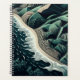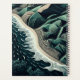 Serene Shores: This stunning top-down illustration captures the harmony of land and sea, featuring waves gently breaking on sandy beaches with lush green mountains in the background. Rendered in soothing shades of dark blue-green, the artwork evokes a sense of tranquility and balance. The intricate detail of the ocean’s patterns meeting the shore, paired with the trees lining the water’s edge, enhances the peaceful atmosphere. Created in a woodcut print style with simple lines and a flat design, the piece is reminiscent of hand-drawn animation, offering a timeless, serene depiction of nature’s beauty.