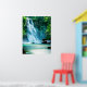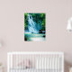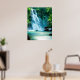Poster in einer Abbildung eines kaskadierten Wasserfalls in blass blau mit weißem Spray, umgeben von Felsen und grünen Blätter