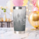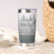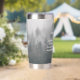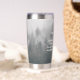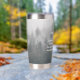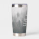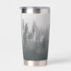 Ein trendiger Edelstahl-Thermalwäscher für Ihr warmes oder kaltes Getränk, der ein umgehendes Foto eines scheußlichen, nebeligen, immergrünen Waldes mit den inspirierenden Worten des Serenity Gebet in weißer, stilisierter Schrift zeigt.