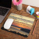 Standardmauspad für Ihre Computerarbeitsplatte, das das Foto eines leuchtenden, orangefarbenen Sonnenuntergangs mit den inspirierenden Worten des Serenity-Gebet zeigt.