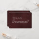 Cette belle carte d'invitation de toiletteur de 5" x 7". C'est mieux pour le marié. Si vous cherchez à demander à quelqu'un d'être votre toiletteur pour votre futur mariage, alors pourquoi ne pas choisir ces cartes de toiletteur. Cette carte d'invitation customisée fera de votre ami, frère, cousin, neveu, fils ou qui que ce soit d'autre que vous choisissez sentir cet extra spécial. Cette invitation est facilement personnalisée en cliquant sur le bouton customiser sous l'image où vous pourrez changer le texte, la police et la taille. Vous pouvez invitation vos meilleurs copains avec style avec ces invitations classe. Il convient au Best Man ou aux Groomsmen. Envoyez-leur cette carte de groomsmen.