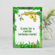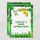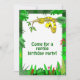 Ces invitations ont un serpent jaune mignon de bande dessinée lové dans un arbre. Il a les taches brunes sur un corps jaune et sourit, avec ses crocs et langue collant. L'avant des invitations indiquent, "venu pour une fête d'anniversaire de reptile." Changez ce message dans le modèle.
