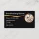 Cartes de visite Classy pour un service de plomberie ou de plomberie avec emblème à thème de plomberie couleur or qui a diverses pièces de plomberie et élément de design couleur or qui agit comme un séparateur qui aide à organiser le modèle que vous pouvez customiser en ligne.