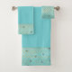 Serviette de bain à thème de sirène amusante sertie dans un bleu turquoise, avec un motif turquoise à échelle or et . Customisez d'ajouter du texte à ce joli ensemble de serviettes.