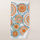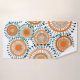 Ce kit de serviettes a un design d'anneaux et de cercles dans les tons orange avec des lignes turquoises qui les traversent formant des fleurs sur un champ de blanc.