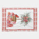 Serviette de cuisine festive qui présente un topiaire de Noël coloré avec un cardinal et des cadeaux de Noël à sa base.