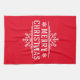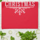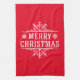 Serviette de cuisine de couleur rouge avec imprimé Joyeux flocon de Noël. Customisez cet objet ou achetez tel quel.