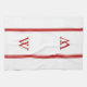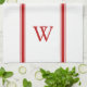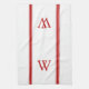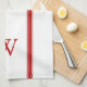 Serviette de cuisine personnalisée rayée rouge monogramme. Monogramme rouge en texte en bloc classique sur les bords supérieur et inférieur dans les panneaux extérieurs rayés rouges. arrière - plan blanc.