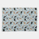 De mignons bergers australiens / chiens australiens en manteaux noirs, bruns et merles s'assoient et tiennent des os et des empreintes de pattes de chien éparpillés sur un arrière - plan bleu clair.