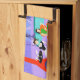 Cette Serviette de cuisine Retro Tropical Cocktail Party est enivrante dans ses détails. Le dessin animé présente le type de cocktail extrêmement sophistiqué que l'on ne voit normalement que dans les films des années 1960. Un salon moderne du milieu du siècle est rempli de fêtards qui apprécient la décoration chic et violette. Une jolie femme en uniforme de domestique française porte un plateau de martinis. Elle se tient à côté d'une cheminée rouge à cônes avec un feu rugissant. Au centre de la pièce, un beau couple s'installe dans des chaises à oeufs d'orange. La femme porte une robe verte et brillante. L'homme porte un costume noir avec une cravate rouge. Ils tiennent chacun un martini. Un autre couple devient cosy sous un lustre suspendu, jaune, Spoutnik. Le distingué homme aux cheveux blancs porte un costume bleu, une chemise bleu clair et une cravate rouge. Il tient aussi un martini dans chaque main, montrant au monde que ses jours de fête sont loin d'être terminés. Son compagnon est une blonde en forme dans une robe rouge étonnante. Derrière cette scène, on peut voir à travers des murs en verre du sol au plafond. La scène extérieure dispose d'une piscine ronde et turquoise. On peut voir la silhouette violette d'une femme plongeant ses jambes dans l'eau. Entre les murs violets en pierre, il y a des silhouettes de palmiers. Les silhouettes de danses et de fêtards parlants sont également visibles. S'il y a une chose que cela prouve, c'est que, tandis que les gens qui vivent dans des maisons en verre ne devraient pas jeter de pierres, ils devraient certainement jeter des fêtes !