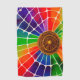 Cette serviette de golf a une toile arc-en-ciel dessus.