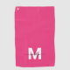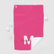 Create Your Own Personalized Custom Pink Modern Script Name Monogram Golf Towel. This girly golf towel now features a vibrant magenta background for a bold, fun pop of color. The design includes a clean white initial paired with a flowing black script name, giving it a personalized look that’s both stylish and modern. Printed on one side, it adds a cute and practical touch to any golf bag. It’s a great gift for birthdays, holidays, Mother’s Day, or any time you want to celebrate a golfer who loves a mix of flair and function. Perfect for anyone who enjoys keeping things bright, chic, and personal on the course.