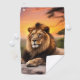 Beau Lion posé sur un rocher avec coucher de soleil de jungle derrière