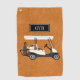 Serviette De Golf Personnalisée. L'avant présente des initiales optionnelles avec un design de voiturette de golf avec quelques bières. Pochette de départ disponible. Conception de Claudine Boerner.