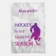 Serviette de patinage de hockey personnalisée en violet "saison préférée" - un cadeau idéal pour les joueurs de hockey féminin qui est utile car il est essentiel de sécher les pales après l'entraînement.Couleur: Dégradé violet à rose chaud sur arrière - plan de glace argenté.Design: "Le hockey est ma saison préférée" + silhouette du joueur de hockey + personnalisation avec le nom de l'amoureux du hockey.