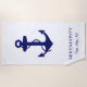 Une serviette de plage chic et moderne sur le thème nautique pour votre bateau qui présente une illustration bleu marine d'une ancre. Personnalisez le nom et l'emplacement de votre bateau dans une élégante typographie et un script bleu marine.