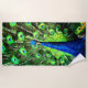 Tentez vos affaires à la plage en allongeant sur cette GORGEOUS serviette de plage aux couleurs vibrantes, avec ce portrait de gros plan d'un paon, en mettant ses affaires à la portée du monde entier. Toute la vitalité de la couleur et la fierté onusienne du paon mâle sont les dons de l'imagination et de la grâce de Dieu, mais l'exécution de la peinture originale de style expressionniste capturant ces cadeaux n'est que du coeur, de l'esprit, de l'ordinateur et des mains de l'artiste numérique, Leslie Sigal Javorek.