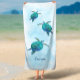 Cette serviette de plage personnalisée comprend des tortues de mer bleu aqua colorées nageant sur un arrière - plan des vagues abstraites de l'océan aquarelle.