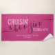 Bright Magenta Pink Cruise Beach Towel avec nom personnalisé et libellé de conservation pour une soirée de croisière et de bozin Bachelorette.