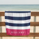 Preppy chic serviette de plage personnalisée en rose et marine dispose de bandes bleu marine et blanc classique large, avec votre nom ou choix de personnalisation le long du fond en lettres blanches audacieuses sur une bande de rose fuchsia vibrante.