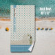 Serviette de plage personnalisée Beach House | Une jolie scène de plage sur une serviette de plage à point de polka est personnalisée avec votre nom de famille. Tout le texte est modifiable de sorte que même "maison de plage" peut être changé à quelque chose d'autre s'il convient mieux à vos besoins. Joli pois bleu sur un arrière - plan crémeux. Une chaise Adirondack est installée sur une plage de sable au bord de l'eau. Un papillon et un amas de saules de chatte ajoutent la touche finale.