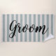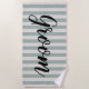 Simple serviette de plage rayée bleu et ivoire stylisée personnalisée avec grand script Groom en lettrant ou en customisant avec votre nom ou autre texte. Utilisez les outils de conception pour modifier les polices de texte et les couleurs ou ajoutez vos propres photos pour créer une serviette de plage personnalisée pour votre lune de miel ou un cadeau mariage unique.