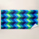 Une serviette de plage au décor motif et coloré de chevrons vert citron, bleu royal turquoise, bleu océan et bleu ciel.