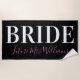 Tapis de plage minimaliste calligraphié rose, blanc et noir pour la mariée avec le nom de famille futur de la mariée pour aider à célébrer la future Mme pendant une fête de bachelorette / week-end de bachelorette.