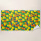 Serviette de plage dans un motif de tulipes orange et jaune et feuilles verts dans un champ