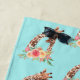 Une serviette de plage avec un joli dessin en aquarelles d'une maman et d'une petite girafe. La girafe mère se repose la tête au-dessus de la petite girafe, aimante et adorable. Joli bouquet de fleurs d'aquarelle rose, jaune, vert placé sous cette paire de chatons. Arrière - plan bleu bébé.