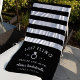 Fêtez votre week-end de bachelorette, votre escapade ou votre fête avec ces serviettes de plage personnalisées uniques. Le design personnalisé présente des rayures blanches et noires croustillantes avec "dernier fling avant l'anneau" flanqué d'une illustration de bague en diamant. Personnalisez avec le nom, l'année et la destination de la mariée.