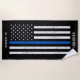 Police American Flag Mince Blue Line nom affligé Beach Towel. Ajouter le nom, le rang, la date, le devis, etc. au tapis. Copyright © 2021 Kymberli Designs - Tous droits réservés.