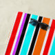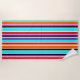 Cette serviette de plage a un design simple de bandes verticales de différentes épaisseurs en rouge, orange, violet, noir, bleu clair et blanc.