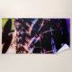 L'illustration sur cette serviette de plage est une photographie originale d'un ensemble de tambour. Les tambours noirs brillants avec leurs jantes argentées reflètent les couleurs des lumières en le studio, les bleus, les rouge et les verts. Des cymbales au-dessus des tambours attendent pour être frappées.