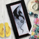 Dragon tribal noir avec un fond gris bleu avec de petites fleurs rouges et une bordure rouge.
