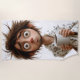 Illustration fantaisiste et relatable d'un homme débraillé en peignoir serrant une tasse de café aux yeux larges et fatigués. Ses cheveux désordonnés et son expression perplexe capturent parfaitement le chaos des premiers matins avant que la caféine ne prenne effet.