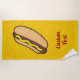 Icône Hot dog. Les aliments indésirables entourent les icônes jaune motif arrière - plan. Texte personnalisé.
